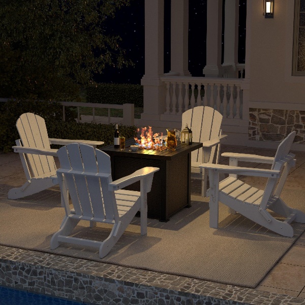 Transform your patio into a warm conversation space with this Outdoor Adirondack Chair With Square Fire Pit Table Sets , this set includes 4-Piece Outdoor Adirondack Chair and a 50,000 BTU cast-top fire pit that also can be used as a coffee table.